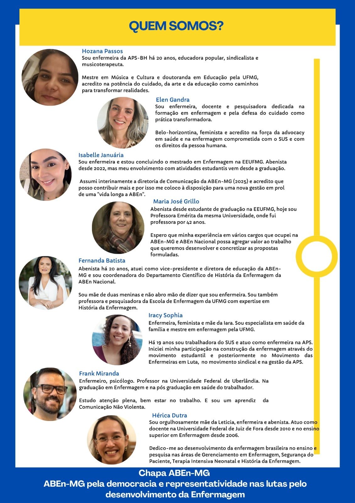 A chapa é composta por enfermeiras e enfermeiros com trajetórias que articulam assistência, ensino, pesquisa e gestão, atuantes em diversas regiões do estado e comprometidos com a defesa do SUS, a formação crítica e o fortalecimento da Enfermagem mineira.