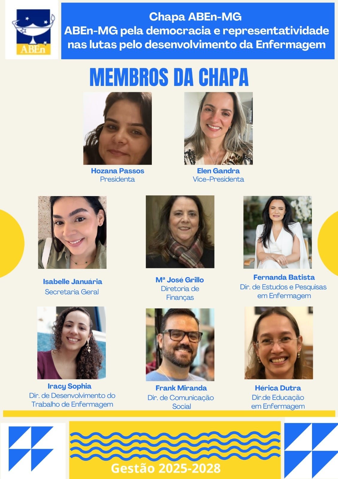 A Associação Brasileira de Enfermagem – Seção Minas Gerais (ABEn-MG) apresenta a chapa inscrita para o processo eleitoral da gestão 2025–2028, intitulada “ABEn-MG pela democracia e representatividade nas lutas pelo desenvolvimento da Enfermagem”.